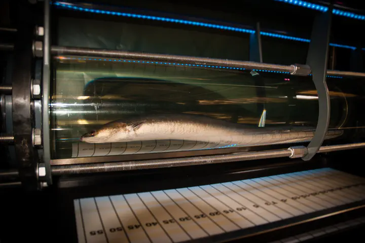 European eel in hyperbaric swimming respirometer. Image credit: Björn Illing